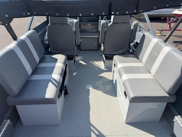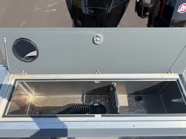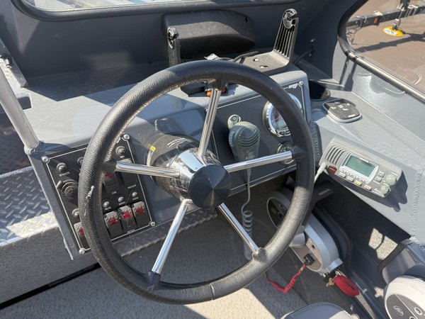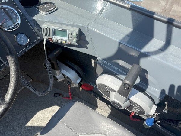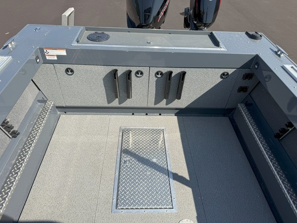 Features include Terrova trolling motor, rod tree, traxstech, ship to shore radio, and bimini with enclosure. Standard features include trim tabs, washdown pump, hydraulic sea star steering, and swim ladder.