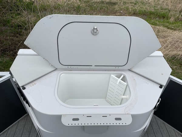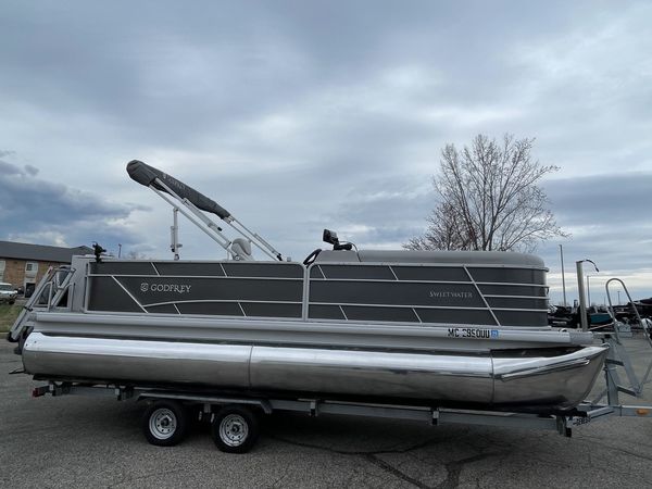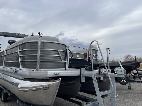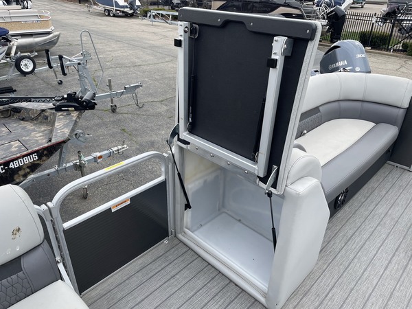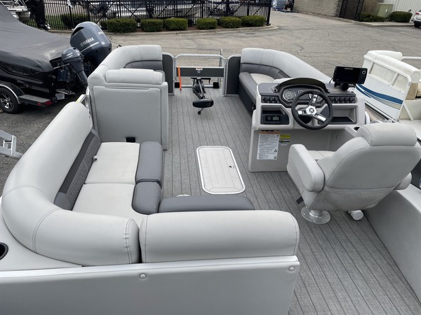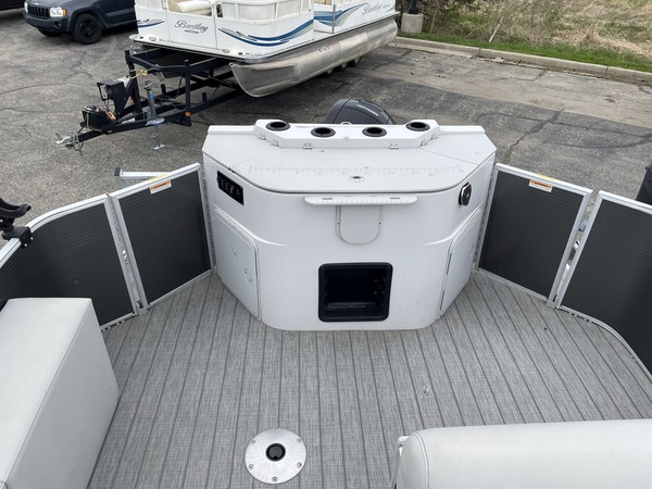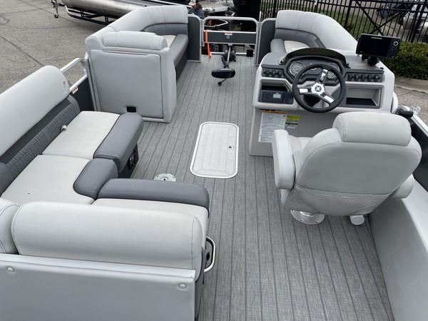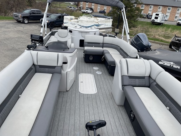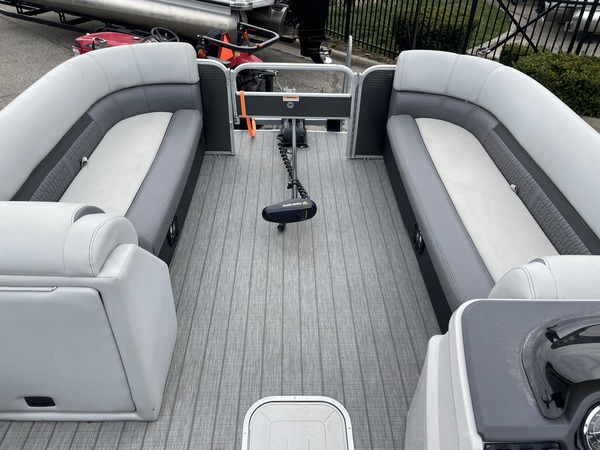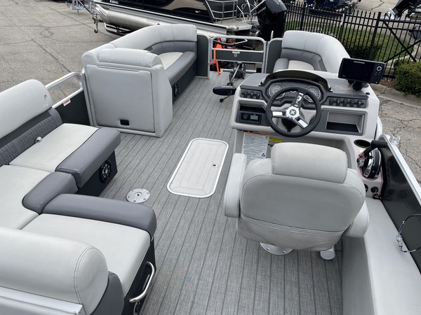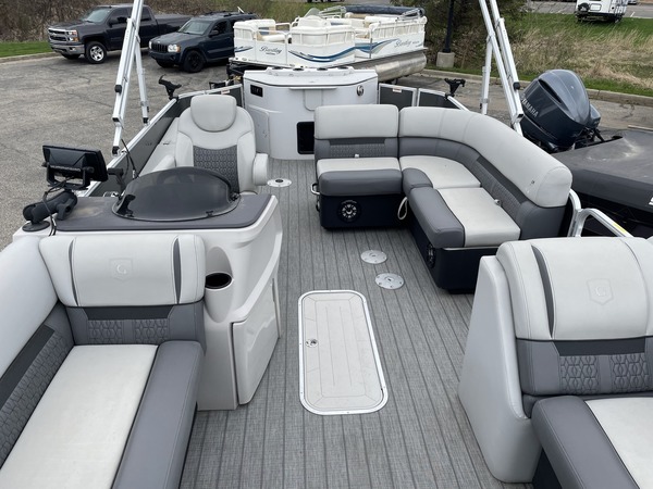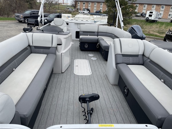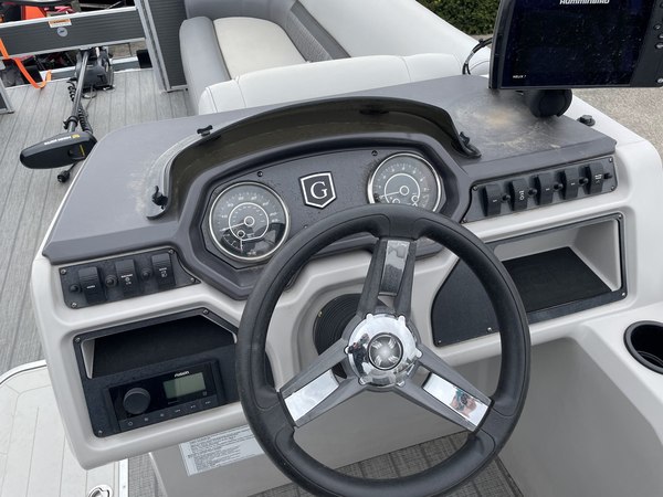 Upgrades include GTP tritoon option, in floor storage, Helix 9, hydraulic steering, windscreen, ski tow bar, LED docking lights, MinnKota Powerdrive, and upgraded upholstery.