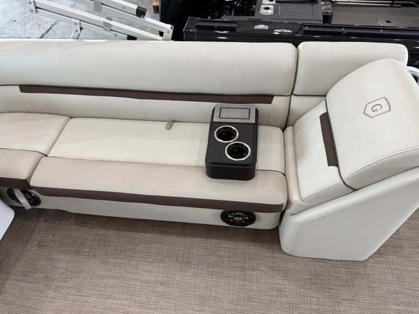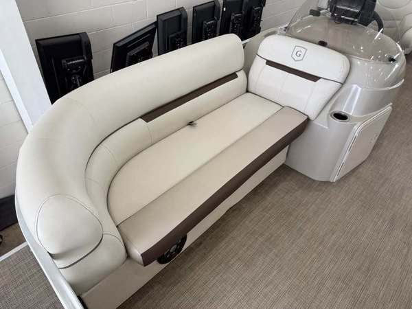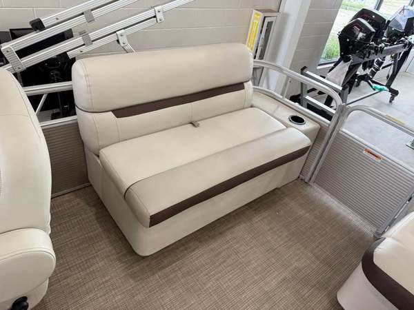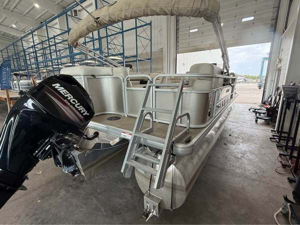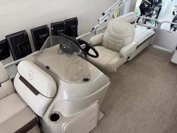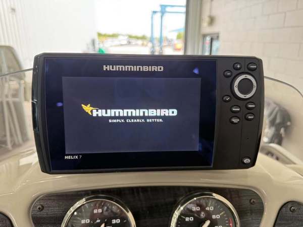 Features include fish seats, bow and stern loungers, Helix 7, livewell, bimini, swim ladder, windscreen, and radio.