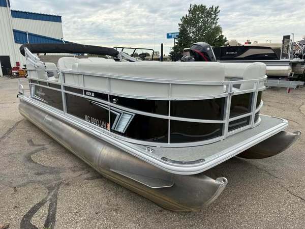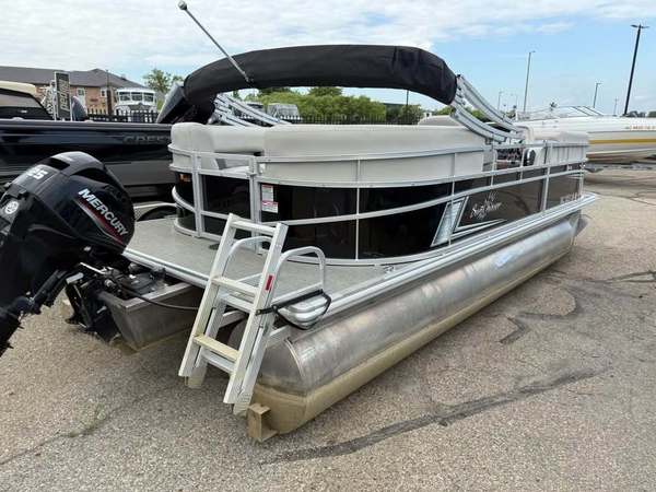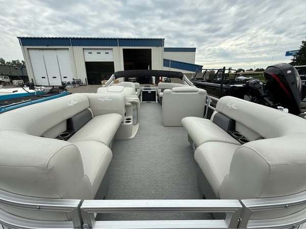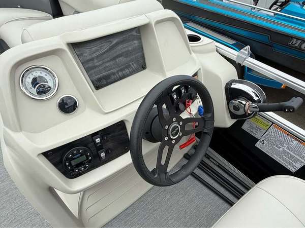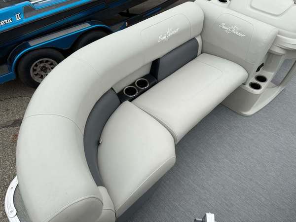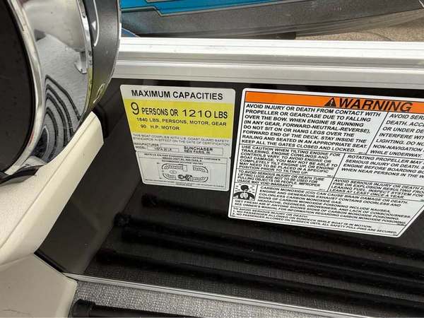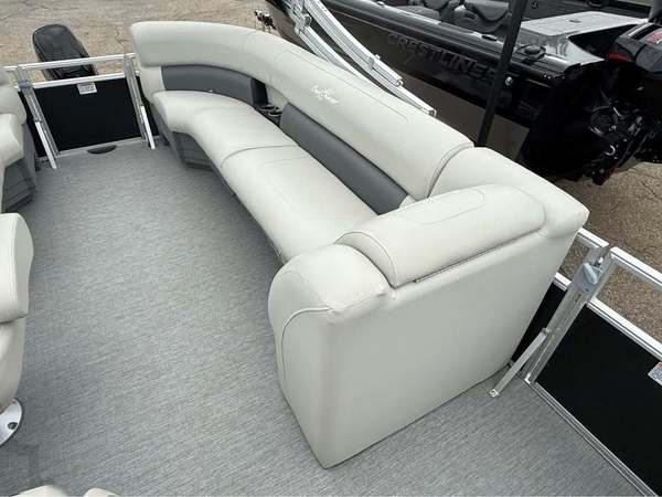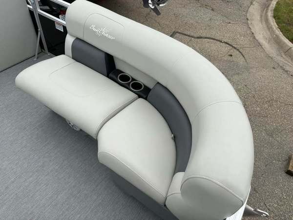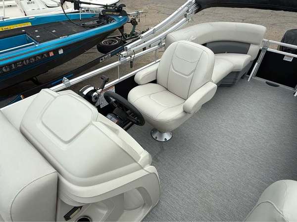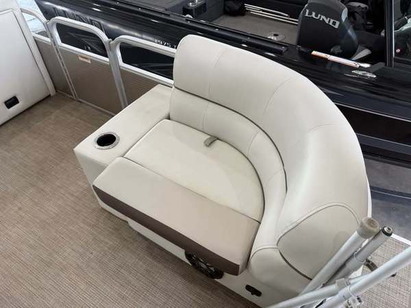 The interior boasts a comfortable layout with bench seating providing ample space for your crew to relax and socialize. But the true stars of the show are the two chaise lounges, perfect for reclining and soaking up the sun in style. For the captain, a low-back captain’s seat offers a touch of luxury while maintaining excellent visibility for navigating the pontoon with ease. This pontoon caters to both relaxation and lounging, making it ideal for creating unforgettable memories on the water, whether you’re cruising with family or friends.